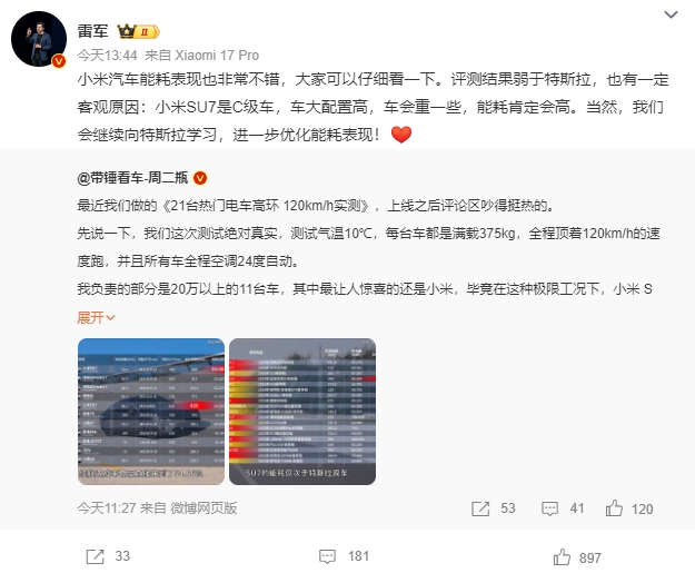 针对外界关于小米SU7能耗表现弱于特斯拉的疑问,雷军也给出了积极且详尽的回应。他表示,小米SU7作为一款C级车,拥有更大的车身尺寸和更高的配置,这自然导致车辆重量增加,进而使得能耗相对较高。雷军坦言:“SU7是C级车配置高,车会重一些,能耗肯定会高。”但他同时强调,小米汽车并不会因此满足,而是会继续向特斯拉等优秀企业学习,不断优化自身的能耗表现。